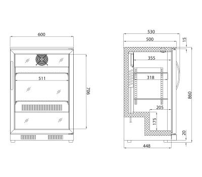 Con una capacità di 124L e un‘altezza di 860 mm, con esterno in acciaio verniciato nero ed interno in alluminio, questo prodotto con 1 porta battente in vetro è equipaggiato con 2 ripiani cromati regolabili, porta autochiudente, serratura, luce LED interna, termostato digitale e vetro temperato di sicurezza.